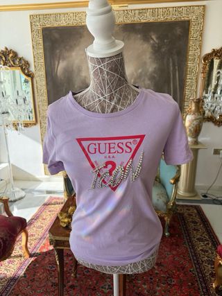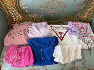 Conjunto de tres camisetas Guess originales, talla S. Perfectas para un look casual y a la moda. - Camiseta rosa con logo Guess Los Angeles. - Camiseta blanca con logo Guess U.S.A. y detalles de pedrería. - Camiseta azul de canalé con botones.