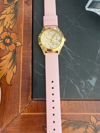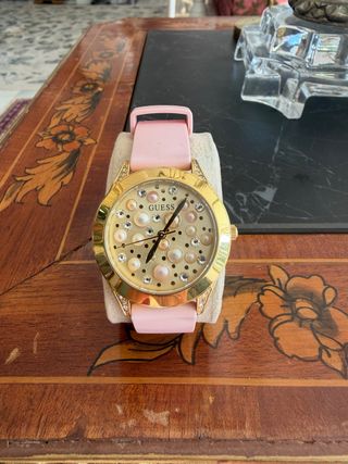 Elegante reloj de la marca Guess con un diseño llamativo. - Esfera con perlas y detalles brillantes. - Correa de color rosa. - Bisel dorado.