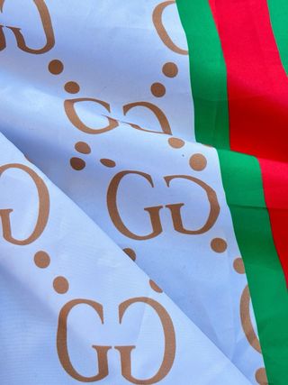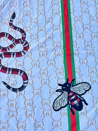 Capa de peluquería y barbería con diseño exclusivo. - Estampado icónico de la marca. - Ilustraciones de serpiente y abeja. - Tiras de color verde y rojo.