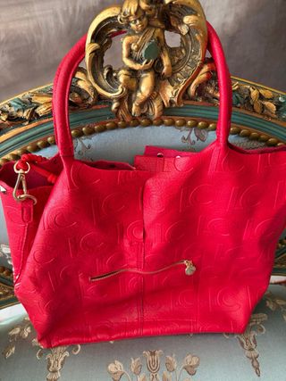 Bolso de mano o al hombro de la marca Lola Casademunt en color rojo. - Diseño con relieve de iniciales. - Adornos de tachuelas metálicas. - Asa trenzada. - Incluye correa ajustable.