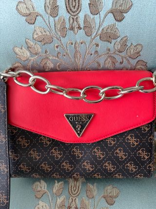Bolso Guess con diseño moderno y llamativo. - Combinación de colores rojo y marrón. - Correa ajustable para llevar al hombro o cruzado. - Detalle de cadena metálica en la solapa. - Logo de Guess en la parte frontal. 24x20 cm Orginal