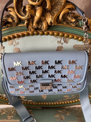 Bolso Michael Kors con un diseño llamativo. - Acabado en tono azul. - Detalles metálicos dorados. - Asa de cadena y correa ajustable.