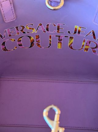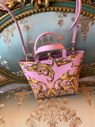 Elegante bolso de la marca Versace Jeans Couture con un llamativo estampado. - Diseño en color rosa con detalles dorados. - Medidas aproximadas: 30 cm x 20 cm.