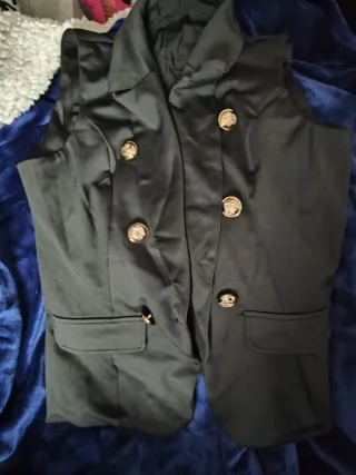 Elegante chaleco estilo blazer, perfecto para añadir un toque sofisticado a cualquier atuendo. - Diseño de doble botonadura. - Bolsillos frontales con solapa. - Botones dorados decorativos.