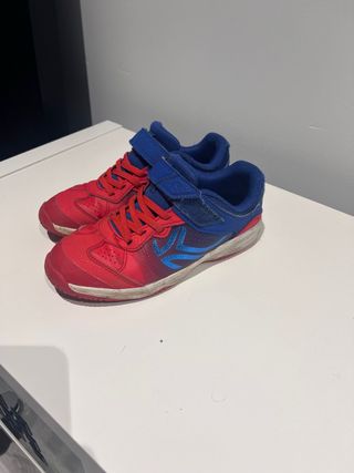 Zapatillas de fútbol sala para niño, TALLA 34 con un diseño llamativo en dos tonos. - Cierre de velcro para un ajuste fácil. - Suela de goma para un buen agarre.