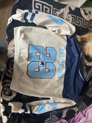 Camisa de manga larga con diseño deportivo. - Estampado California en la parte delantera. - Número 23 en la manga. - Detalles en azul marino y beige.