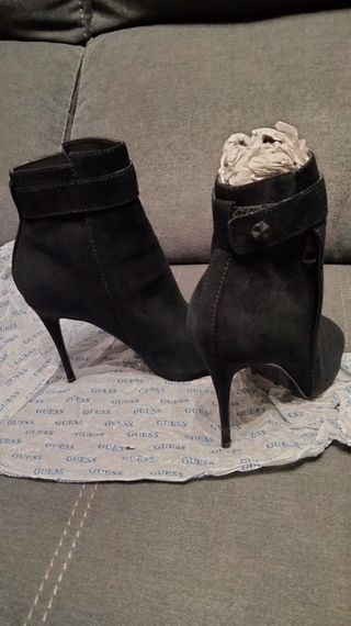 Preciosos botines de tacón alto de la marca Guess. Son de color negro y están prácticamente nuevos. - Material: ante. - Tacón fino y alto. - Cierre con cremallera lateral. - Diseño elegante y sofisticado. - Ideales para cualquier ocasión.