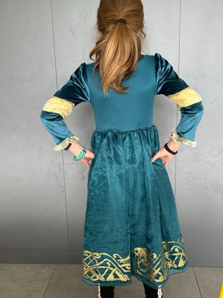 Disfraz de Mérida de la película Brave, ideal para fiestas o juegos. - Diseño de terciopelo verde. - Detalles dorados en el cuello y puños. - Cinturón con broche decorativo y lazo de cuadros. - Adorno de grecas doradas en el bajo. De regalo Arco y karkaj