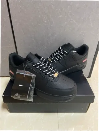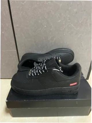 Zapatillas Nike Air Force 1 x Supreme en color negro y detalles dorados. Talla 38. - Diseño icónico de Air Force 1. - Colaboración exclusiva con Supreme. - Cordones con logo Supreme. - Detalle de logo Supreme en el lateral.