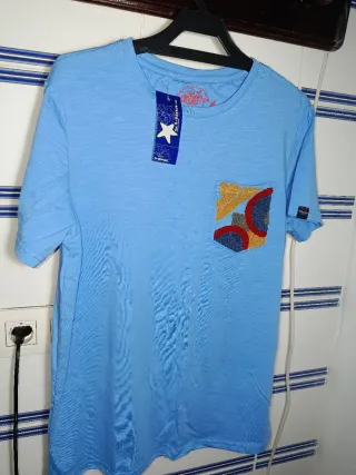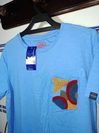 Camiseta de manga corta para hombre de la marca DARKFISH. - Color azul claro. - Bolsillo frontal con diseño estampado multicolor. - Cuello redondo.