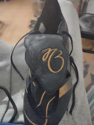 Botas de fútbol Adidas Predator, modelo asociado a Jude Bellingham. - Diseño en negro con detalles dorados. - Cordones negros.