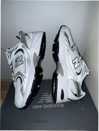 Zapatillas deportivas New Balance 530 en talla 42. Combinan blanco, plata y detalles en azul marino. - Diseño deportivo y moderno. - Materiales de calidad.