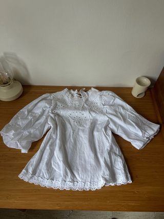 Blusa blanca con un diseño elegante y detalles que la hacen única. - Mangas abullonadas. - Cuello alto con cordones para ajustar. - Adorno de encaje en el bajo.