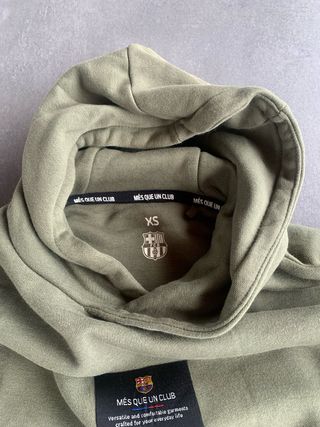 Sudadera con capucha del FC Barcelona en color verde oliva. Presenta un diseño moderno con un parche distintivo en la parte frontal. - Parche con el escudo del club y el lema Més que un club. - Bolsillo tipo canguro en la parte delantera. - Puños y bajo elásticos.