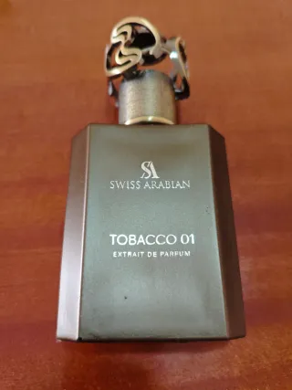 Perfume árabe Swiss Arabian Tobacco 01, con un aroma amaderado. Se ha usado muy poco, prácticamente está nuevo al 95%. - Formato: Extrait de Parfum. - Diseño de botella elegante con detalles dorados y marrones. No envío perfumes.