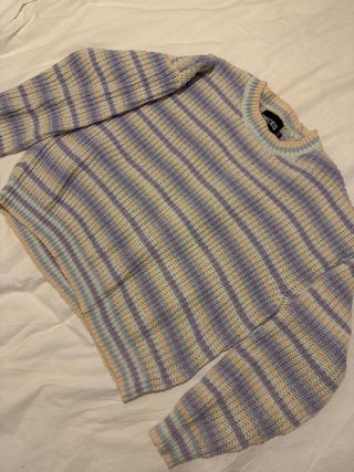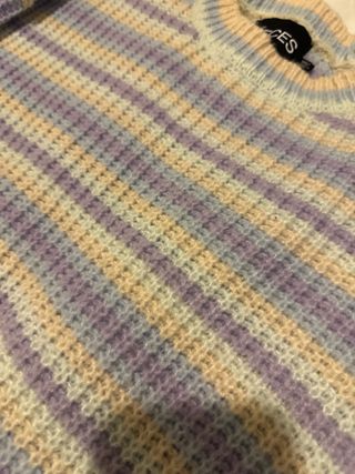 Jersey de punto con un diseño de rayas multicolor. Es una prenda cómoda y versátil. - Diseño de rayas horizontales. - Cuello redondo. - Manga larga.