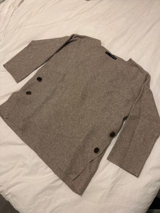 Jersey de punto fino en color beige, con un diseño moderno y detalles que marcan la diferencia. - Detalle de botones dorados en los laterales. - Corte asimétrico con aberturas. - Manga 3/4