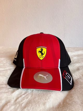 Gorra de la escudería Ferrari piloto Charles Leclerc. - Diseño bicolor en rojo y negro. - Tamaño ajustable - Nueva, sin uso. Conserva cartón interior y etiqueta.