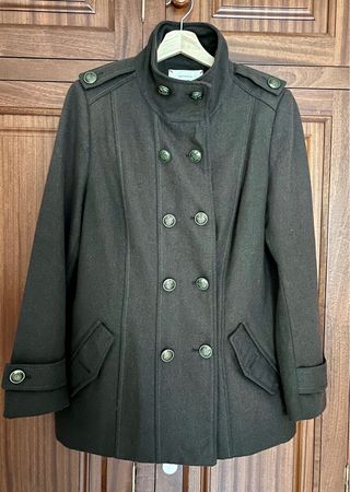 Elegante abrigo de paño de la marca H&M. - Color negro. - Diseño clásico con botones. - Cinturón para ajustar la cintura.