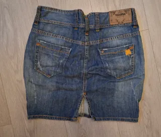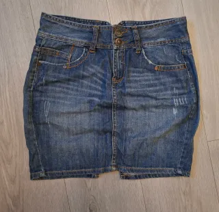 Minifalda de estilo vaquero. - Diseño desgastado. - Dos botones en la cintura. - Bolsillos delanteros.