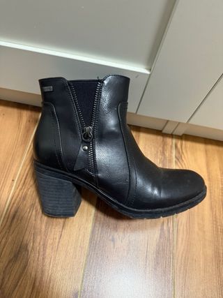 Botines negros para mujer con tacón. - Cierre de cremallera lateral. - Detalle elástico en el lateral. - Tacón grueso.