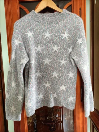 Jersey de punto con estampado de estrellas. - Diseño multicolor con base gris. - Cuello redondo. - Manga larga.