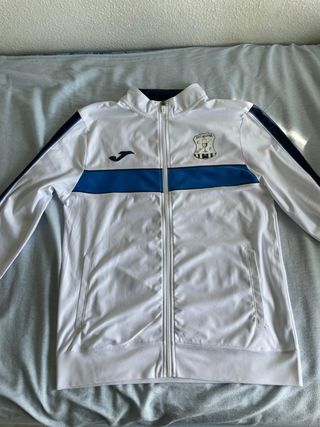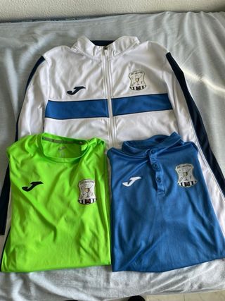 Pack de ropa deportiva del C.F. Jerez Industrial. Chaqueta Color blanco con detalles en azul y azul marino en talla M, logo de Joma bordado, escudo del club en el pecho y cremallera frontal. Polo azul a juego con la chaqueta también n en talla M. Camiseta de juego o entrenamiento en color verde fosforito en talla M. Las 3 prendas se encuentran en buen estado ya que tiene poco uso, se pueden vender por separado y se aceptan ofertas.