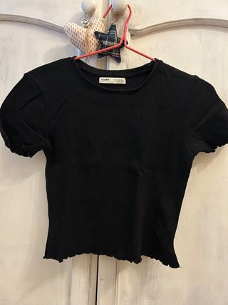 Camiseta básica negra ajustada de canalé mujer Pull&Bear de manga corta con los bordes ondulados y cuelo redondo talla L. - Manga corta. - Bajo y mangas con acabado festoneado.