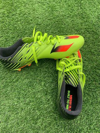 Botas de fútbol Adidas Messi 15.3 en llamativo color verde con detalles naranjas. Diseñadas para ofrecer un gran rendimiento en el campo. - Diseño inspirado en Messi. - Cierre con cordones. - Logo de Adidas en la suela interior.