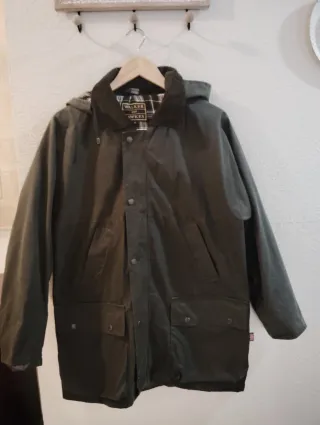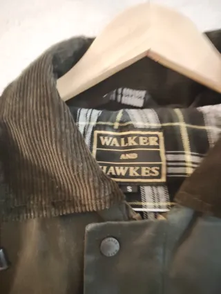 Abrigo encerado de la marca Walker and Hawkes, en color verde y talla S. Se encuentra en perfecto estado, solo ha sido usado una vez. - Cierre con botones. - Cuello de pana. - Forro interior a cuadros.