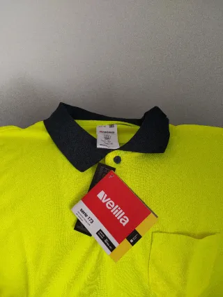 Polo de trabajo de alta visibilidad con cuello negro y detalles reflectantes. - Parte superior en color amarillo fluorescente. - Banda reflectante horizontal en la zona del pecho. - Parte inferior en color azul marino. - Pequeño bolsillo en el pecho.