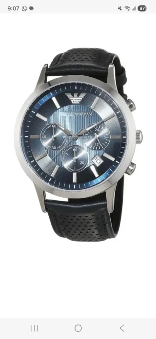 Elegante reloj Emporio Armani, nuevo y sin estrenar. - Esfera con detalles en azul y plateado. - Correa de cuero negra perforada. - Diseño de cronógrafo con tres subesferas. - Ventana de fecha.