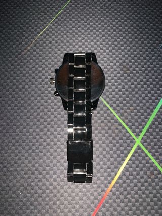 Elegante reloj con diseño moderno. - Esfera negra con detalles en azul. - Correa de malla metálica negra.