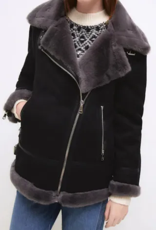 Equivalente a talla M o L, ya que es amplia Cazadora de estilo motero con forro de pelo - Cierre de cremallera asimétrico. - Cuello con solapas y detalle de pelo. - Puños y bajo con acabado de pelo. - Bolsillos frontales con cremallera.