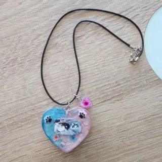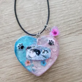 Pide el tuyo con tu peludito!!!Collar artesanal con forma de corazón, decorado con fotos de gatos, flores secas y huellas de patitas. - Diseño bicolor: azul y rosa. - Incluye colgante adicional con flor. - Cierre con cordón negro.