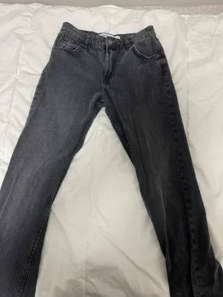 Pantalones vaqueros de corte recto en color gris. Son cómodos y versátiles. - Cintura alta. - Cierre de cremallera y botón. - Bolsillos delanteros y traseros.