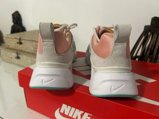 Zapatillas deportivas Nike RYZ 365 con un diseño moderno y llamativo. - Combinación de colores rosa y blanco. - Detalles en turquesa y amarillo. - Suela gruesa y robusta.