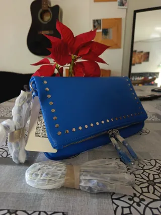 Bolso de mano en llamativo color azul, con un diseño moderno adornado con tachuelas metálicas. - Dos cadenas para llevarlo de diferentes maneras. - Cierre de cremallera. - Detalle de tachuelas a lo largo del bolso.