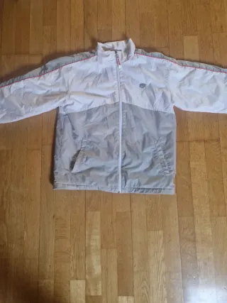 Cortavientos original de estilo Y2K, perfecto para un look streetwear. - Diseño bicolor en blanco y gris. - Ribetes en color rosa. - Logo de la marca en el pecho.