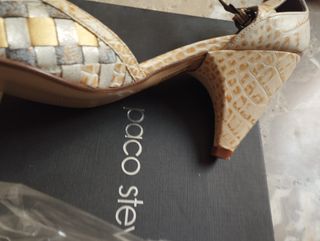 Elegante zapato de mujer con un diseño tejido en la parte delantera y detalles en piel. - Diseño tejido en beige y dorado. - Tacón con acabado texturizado. - Tira de ajuste al tobillo.