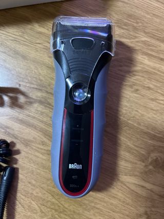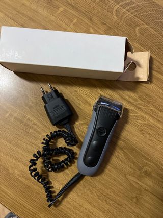 Afeitadora eléctrica de la marca Braun. - Diseño ergonómico en color gris y negro. - Incluye cargador con cable en espiral.