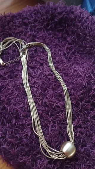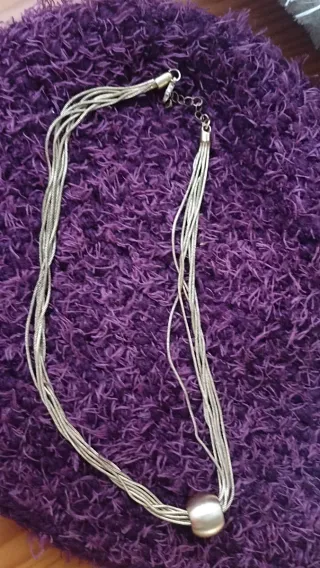 Elegante collar con múltiples cadenas finas y un colgante esférico central. - Diseño de varias hebras. - Colgante metálico liso y pulido.