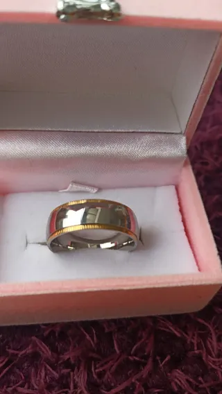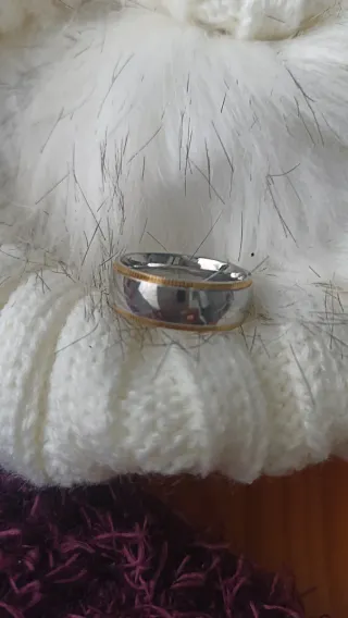 Elegante alianza con un diseño bicolor que combina tonos dorados y plateados. - Acabado pulido. - Borde texturizado.