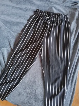 Pantalón de rayas verticales en color negro y blanco. Diseño moderno y cómodo. - Cintura elástica con cordón ajustable. - Corte recto. - Tejido ligero.