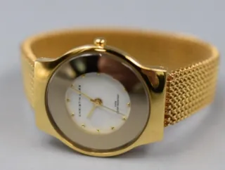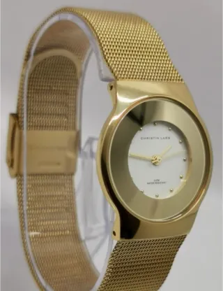Elegante reloj de pulsera con un diseño moderno y sofisticado. - Caja y malla de acero inoxidable en tono dorado. - Esfera blanca con detalles dorados. - Resistente al agua 3 ATM. Pulsera regulable al tamaño deseado.