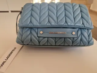 Elegante bolso Karl Lagerfeld con diseño tejido. Cartera bandolera. Medidas 22x12x3 cm - Color azul. - Cadena metálica. - Placa con el nombre de la marca.