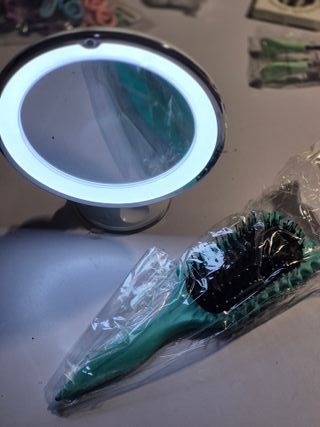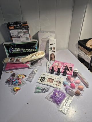 Lote variado de productos para el cuidado personal y belleza. - - secador y plancha para el pelo. - Espejo led de aumento 10x. - Cepillo para pelo rizado. - Uñas postizas. - Esmaltes de uñas. - Pestañas postizas. - Accesorios para el pelo. - Esponjas - peine y cepillo
