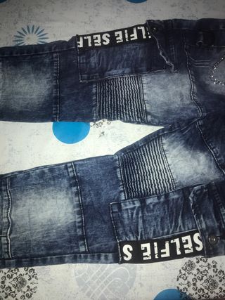 Pantalones vaqueros de dril con un diseño moderno y detalles únicos. - Acabado desgastado en tono azul. - Cadena decorativa plateada. - Cremallera frontal. - Bolsillos prácticos.