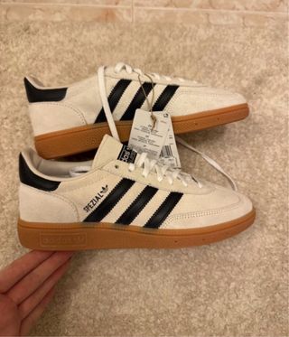 Zapatillas Adidas Handball Spezial en color beige con detalles en negro. Un clásico con suela de goma.Zapatillas originales, nuevas, me las han traído de Estados Unidos y no me valen y las vendo para comprarme mi talla. Talla 38 2/3. Es un 38 dos tercios, yo tengo una 38 y tallan más, se acercan más a la 39. Son entre gris y beige no sabría decir el color exacto. - Diseño icónico de tres rayas. - Detalle Spezial en el lateral. - Suela de goma marrón. - Cierre con cordones.