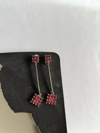 Elegantes pendientes largos con un diseño delicado. - Cuelgan con una fina cadena plateada. - Cada pendiente tiene un diseño cuadrado con pequeñas piedras rojas incrustadas.